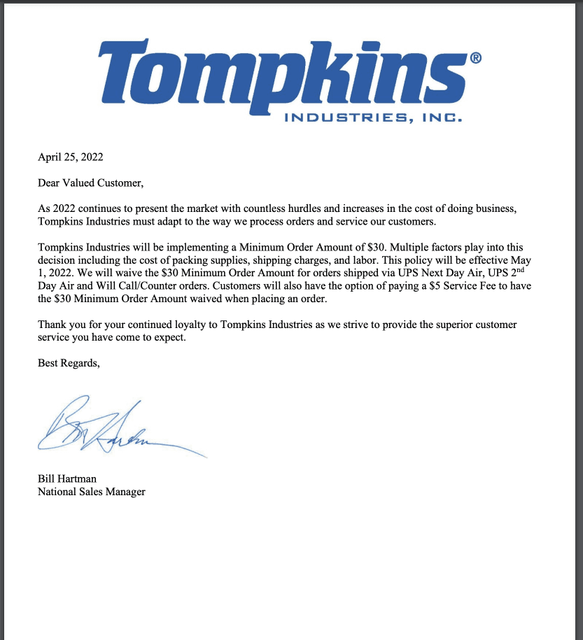 Minimum order and shipping info
